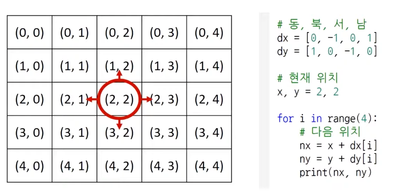 2. 시뮬레이션 및 완전 탐색 문제에서는 2차원 공간에서의 방향 벡터가 자주 활용됨.